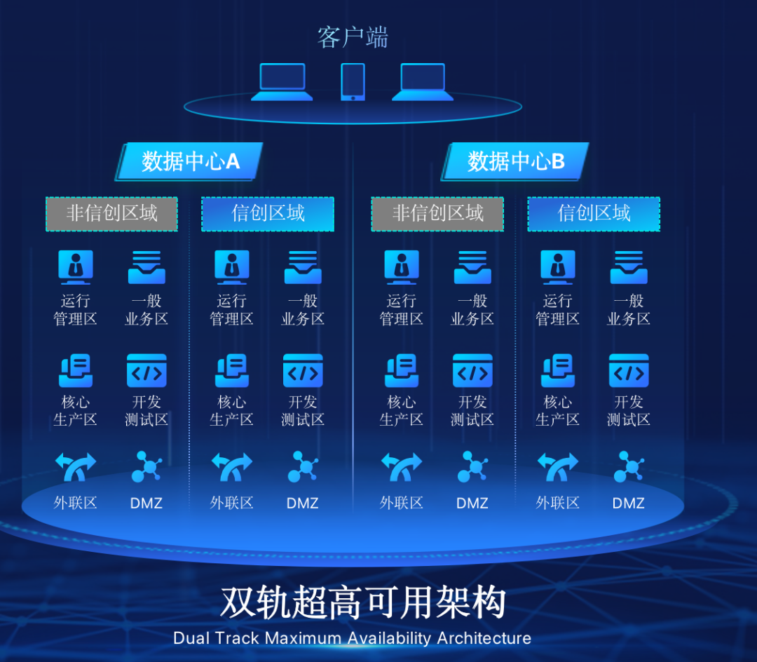 Omipay在企业面临自主创新IT基础重构过程中,推出的全新架构双轨超高可用架构(简称DTMAA),在双活数据中心的分区调度基础上,添加每个数据中心内信创域和非信创域的分域调度,来实现分区分域协同的多活双轨超高可用。